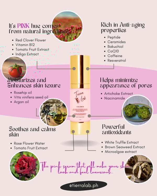 A naturally pink serum formulated to nourish aging skin, enhance skin texture, minimize pores and reduce fine lines. With no artificial coloring, the pink hue comes from natural ingredients (Vitamin B12, red clover flower, tomato fruit extract and indigo plant). Also packed with super antioxidants such as red clover, white truffle, microalgae, seaweed and CoQ10. It has bakuchiol, the natural retinol, which works as effective as retinol but gentle, mild, safe and doesn't cause any irritation.